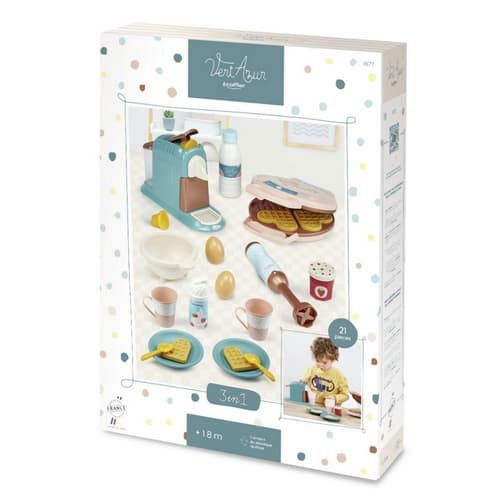 Snídaňová sada 3 v 1 pro malé kuchaře. Sada obsahuje 3 spotřebiče - kávovar, vaflovač a tyčový mixér.