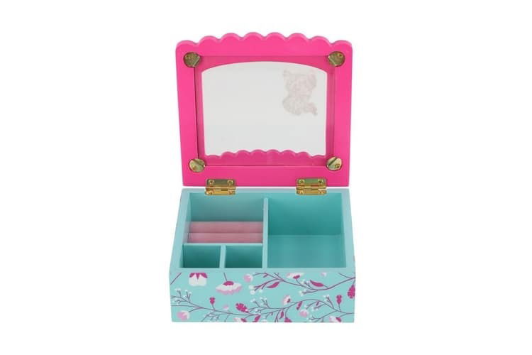 Šperkovnice bude ideálním místem pro uložení pokladů každé dívky. Je vyrobena ze dřeva a má skleněné víko. Šperkovnice má modrou barvu a je pomalována krásným motivem kytiček. Víko je růžové, má na sobě kytičky a samolepku princezny. Tato barevná kombinace bude ideální doplněk pro dětský pokoj. Uvnitř je prostor pro pořádání suvenýrů nebo šperků.
