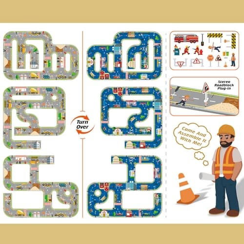 - Interaktivní herní podložka a sada dílů s dopravními značkami a postavičkami pro vytvoření rozsáhlého staveniště.