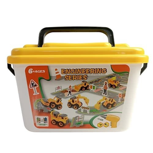 Montážní sada je uložena v praktickém žluto-bílém plastovém boxu s rukojetí. Sada je zaměřena na montáž a demontáž šesti různých stavebních vozidel, jako je bagr, buldozer, domíchávač a sklápěč.