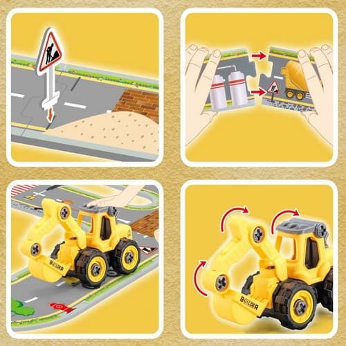 - Sada obsahuje 6 různých stavebních vozidel, které lze rozšroubovat a znovu složit.
