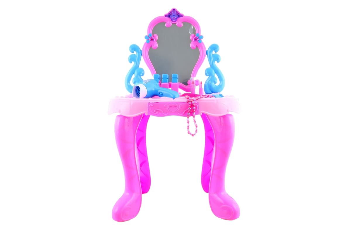 Toaletní stolek pro malé parádnice. Balení obsahuje stolek se zrcadlem, fén (funkční-napájení na 1 AA baterii ), hřeben, korále, 3 prstýnky, samolepky a menší d...