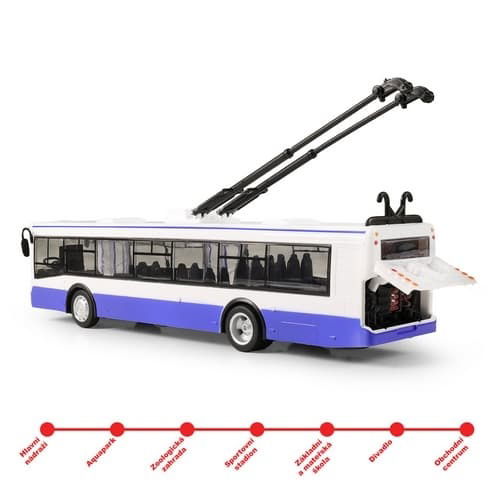 Rychle nastoupit, zavřít dveře a jedeme! Tento originální trolejbus oznamuje zastávky v českém jazyce a jezdí i zpětným chodem. Dveře lze manuálně otevřít a zavírají se pomocí tlačítka na střeše vozu. Při každém otevření se ozve hlášení, při zavření navíc blikají přední světla. Trolejbus je vyroben v délce 28 cm v měřítku 1:43 a je ideální pro malé fanoušky ekologické dopravy.
