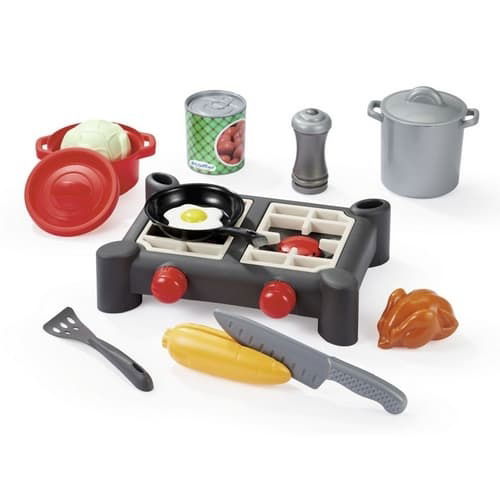 Dvouplotýnkový vařič se sadou hrnců s pokličkami, rendlíky, pánvičkou, potravinami a dalším příslušenstvím. Sada obsahuje 14 ks. Rozměry variče 21 x 17 x 5 cm...