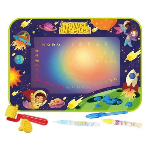Water Magic – Travel in Space je kreativní podložka určená pro kreslení pouze za pomoci vody, což zajišťuje čistou a bezpečnou hru bez rizika zašpinění.