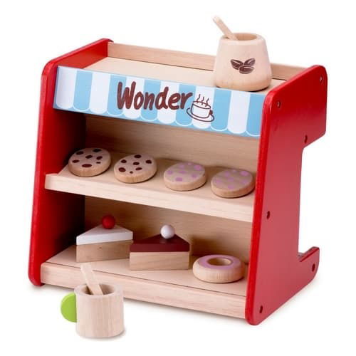 Souprava kompaktního a přenosného kávovaru pro děti, které si rády hrají na baristy, Vás překvapí propracovanými detaily. Na jedné straně naleznete kávovar s odnímatelnou pákou a pohyblivým dávkovačem mléka i ovládací displej s otočným cvakajícím knoflíkem a malovanými tlačítky. Do poliček na druhé straně kávovaru můžete vystavit dezerty dodávané se soupravou. Součástí balení je také další nádobí. Sada nabízí odolné masivní provedení a kombinuje atraktivní syté barvy s barvou přírodního dřeva.