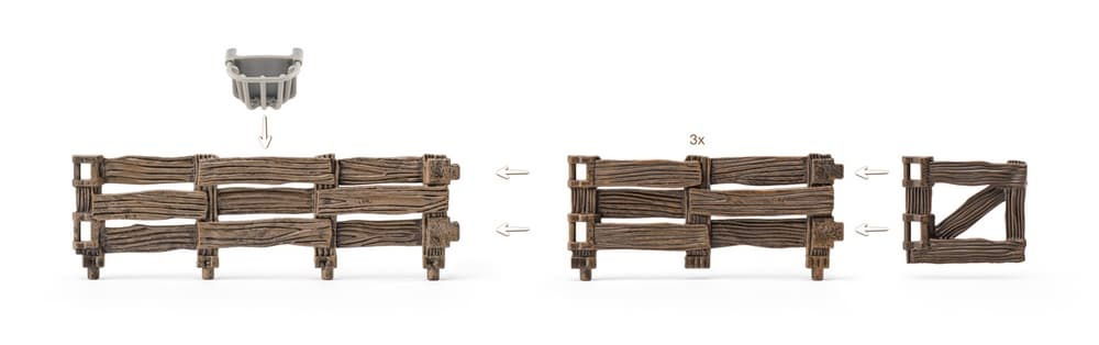 Figurka chovatele a příslušenství: Součástí sady je figurka farmáře/chovatele (v zelené zástěře), který se o zvířata stará. K dispozici má dřevěný vozík (káru) s nářadím (vidle) a krmením (seno/otýpka) a koryta/vaničky na vodu a krmivo pro zvířata.